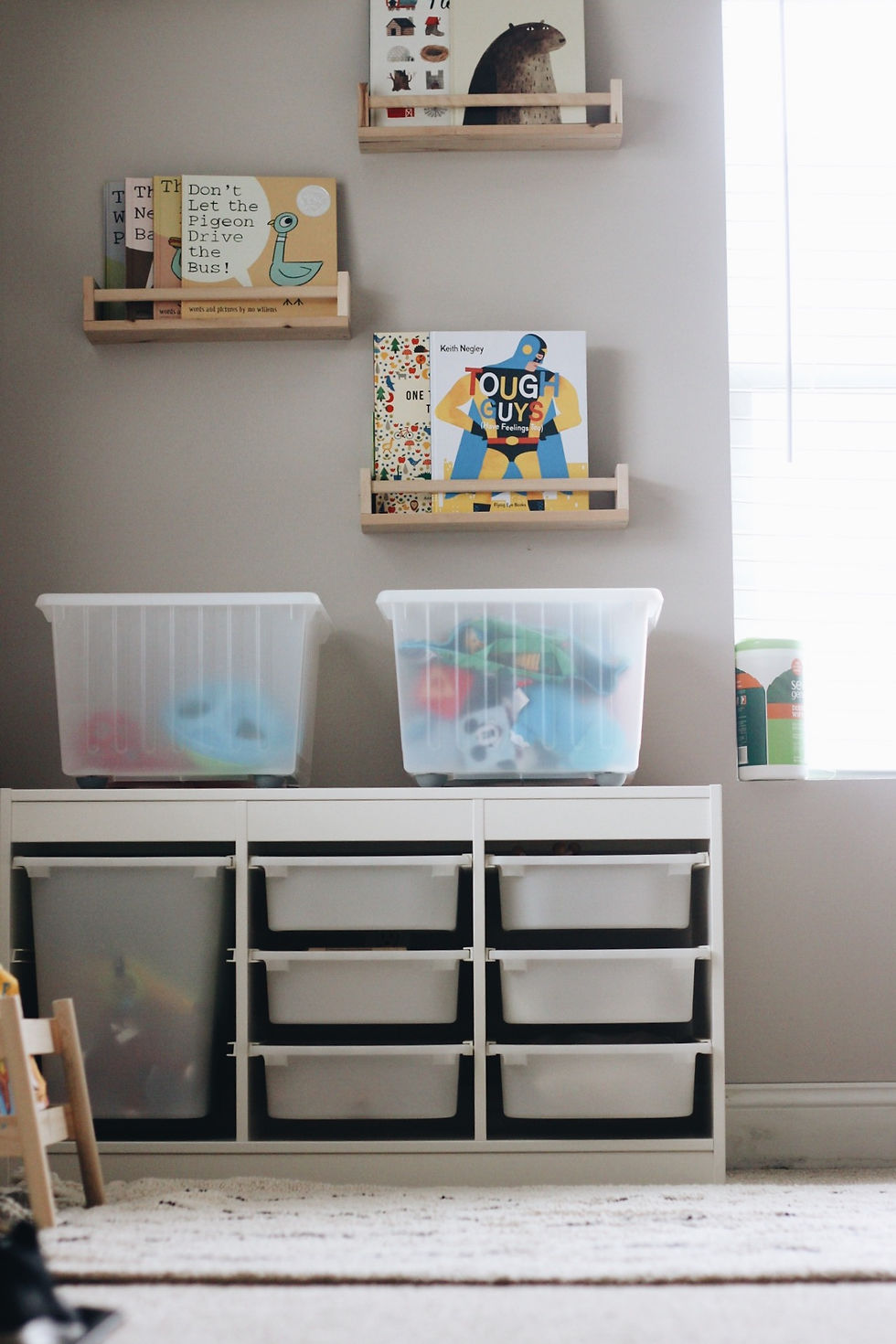 Another feature I knew I wanted was lots of book and toy storage. I have some book shelfs in his nursery but was still quickly running out of room. When I found these "spice racks" from Ikea, I thought they'd go perfectly in his play room. My husband had the idea of staggering them on the wall and I really love how it looks. I decided to put the nicer books that I wanted to read with him on the wall and have a small standing shelf (also Ikea) for board books he could grab himself.